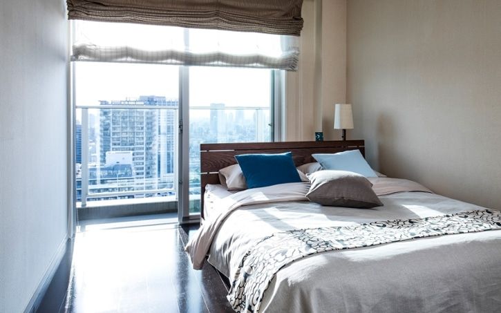 高層階のロケーションを活かした、無機質な眺望と温もりある無垢材が対比された非日常感のある寝室。サイドテーブルを置けないレイアウトですが、ヘッドボードに収納がついているので快適に過ごせます。