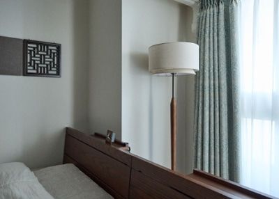コンパクトな寝室に馴染むv02タイプをセレクト。寝室とLDKがひと繋がりになる間取りなので、リビング側の家具も無垢材とベージュ・ライトグレーのカラーコーディネートで揃えて統一感を演出しました。