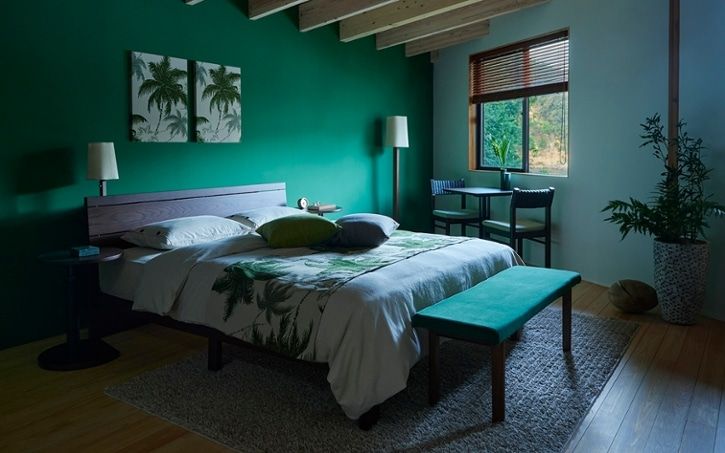 ムク・ベッドv02を2台繋げて配置し、キングベッド使いにしたラグジュアリー感のある寝室。森からインスピレーションを得たグリーンは無垢材家具とも相性がよく、別荘ならではの非日常感のある雰囲気を漂わせます。