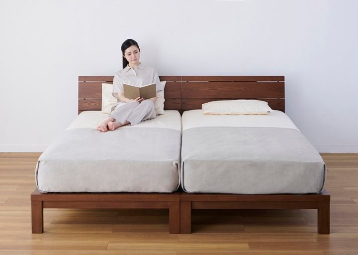 ムク・ベッドは、2台並列でマットレスが寄せられるフレーム設計のため、シングルサイズを2台並列してマットレスを中央に寄せると「キングサイズのベッド」のようにも使えます。
