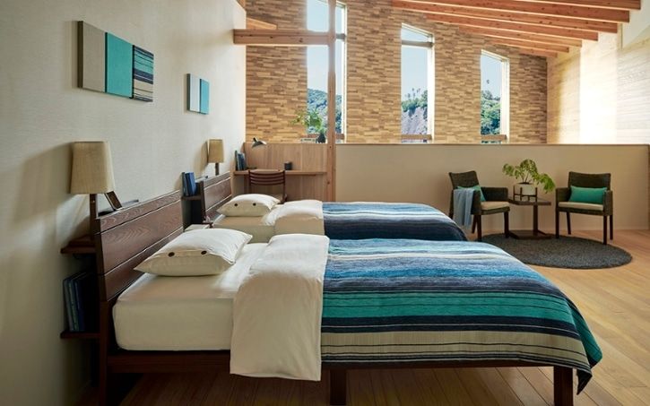 非日常感が溢れる吹き抜けの大空間に映える、ツインスタイルのムク・ベッド。波模様のような爽やかなデザインのベッドスプレッドやターコイズブルーのクッションが、ハワイなど南国リゾートのホテルを思わせます。