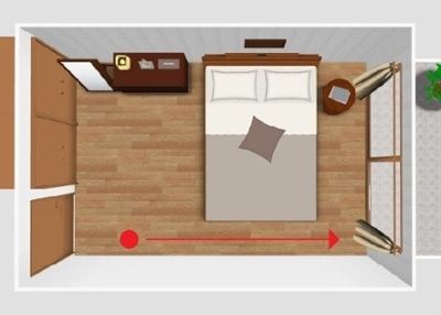 同じ6畳の寝室に、ムク・ベッドのv01タイプとv02タイプをそれぞれ配置した例です。以下のようにベッドを置く場合、ベッドの奥行90mmの違いによって生活動線の見え方も異なります。(寝室の奥行は2600mm)