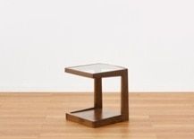 上下に2段の引き出しがついた収納力抜群のサイドテーブル。引き出しのデザインはリバーシブルで、後ろを向けると格子柄になっています。