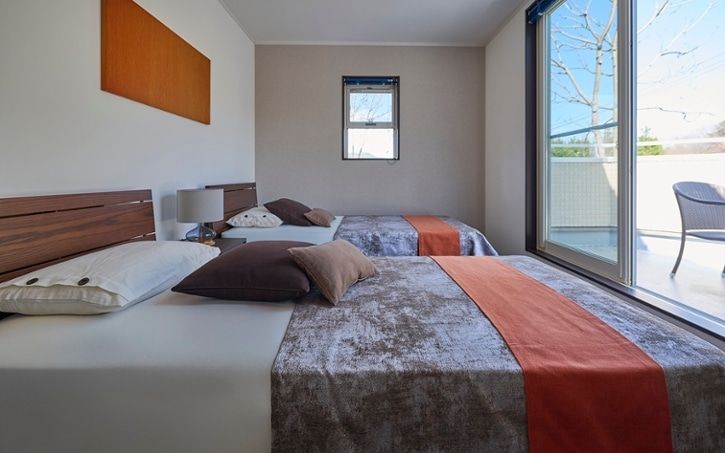 ムク・ベッドのブラウンにオレンジのビタミンカラーをベッドスローとして取り入れることで、別荘ならではの非日常感を楽しめる寝室。ベージュを基調としたシンプルな寝室も、印象的でおしゃれな空間に。