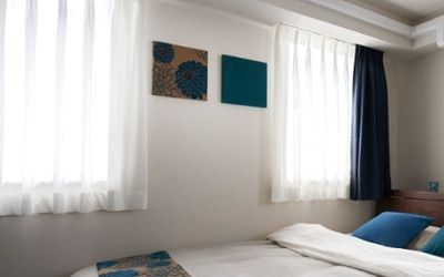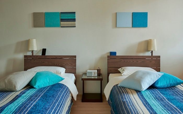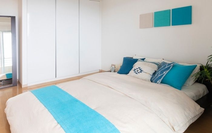 ターコイズブルーの爽やかな寝室イメージ。