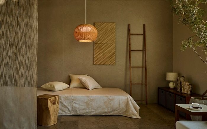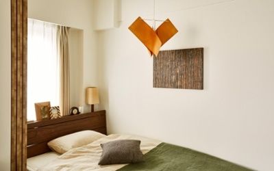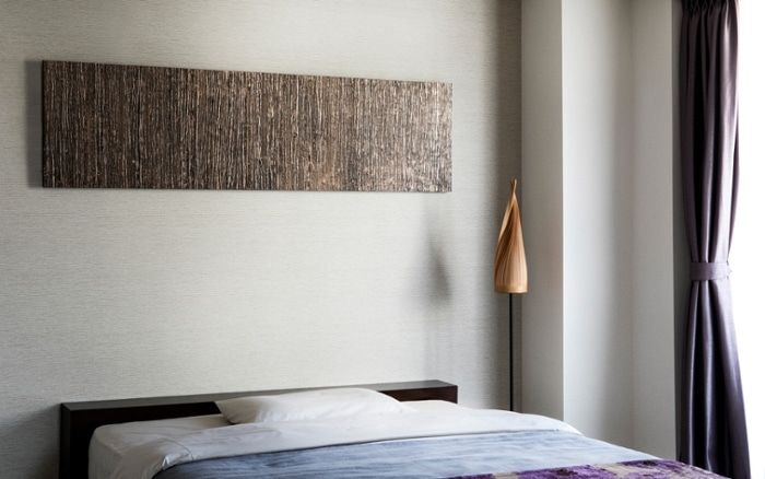 素材感やデザイン性の強い壁面装飾は、小さな面積でも、寝室に印象的なアクセントを加えてくれます。