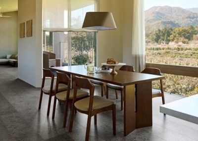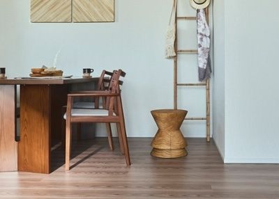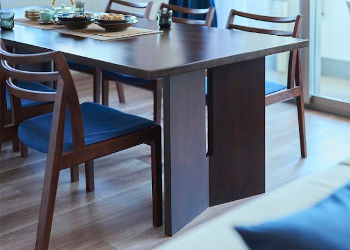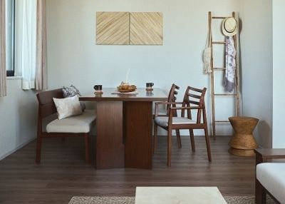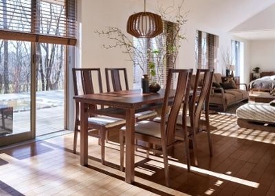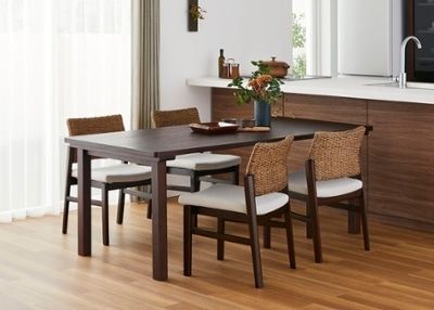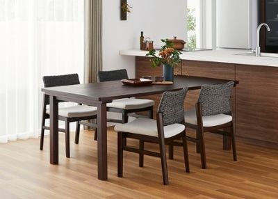 無垢材を使用したダイニングテーブルと合わせることで、統一感を生み出すだけでなく、お互いの素材感を引き立て合い、より印象的な空間づくりが可能に。