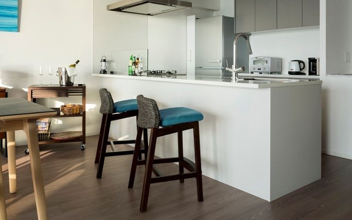 a.flatでは、キッチンカウンターを活かして日々の過ごし方に変化をつけてくれるカウンターチェアをご用意しています。朝食をとったり、子供が宿題をしたり、晩酌を楽しんだり、様々な使い方ができるのが魅力です。