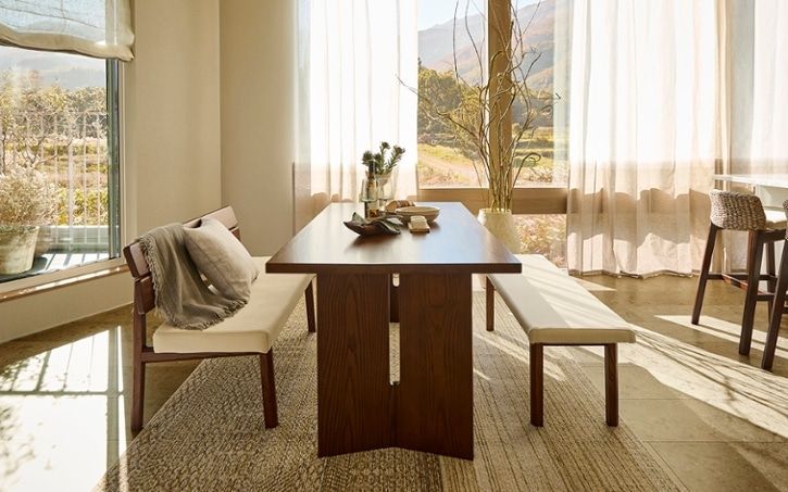 ダイニングベンチを選ぶと、一般的なダイニングチェア4脚と比較して家具自体の数が減るため、見た目がすっきりとした印象に。さらに、背無しベンチの部屋を広く見せる効果や、背有りベンチで素材感をさらに強調するなど、ダイニング空間におしゃれな変化をつけてくれるのもベンチの特長です。