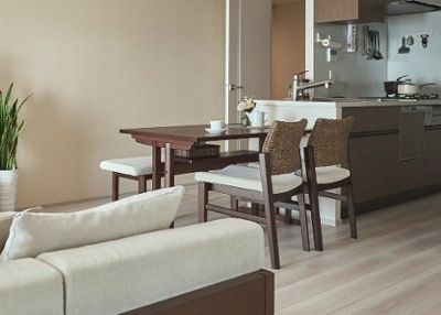 ソファダイニングのスタイルにすることで、カウンターチェアを置くスペースが生まれるケースは多々あります。ダイニングの高さも抑えることができるため、開放的な雰囲気の中でLDKのどの場所にいても会話が弾む暮らしが実現できます。
