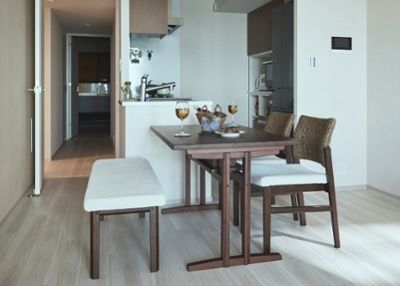 使わないときはテーブルの下に収納可能。通路側にダイニングベンチv01をレイアウトしておくと、広々とした生活動線を手に入れることができます。