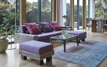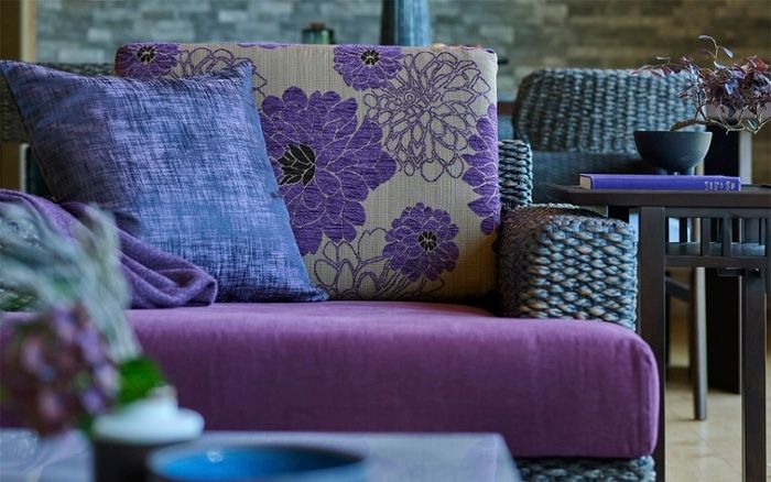 神秘的でエキゾチックなパープルを主役にした、フラワーパープルスタイルを参考にした実例。ラグに大きな花柄を取り入れたことで、印象的な空間に。ダークグレーカラーのヒヤシンス素材のソファが、アジアンリゾートのような異国感を引き立てます。