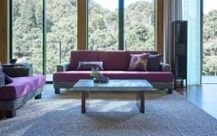 リゾートで眺める夕陽からインスパイアされた、サンセットレッドスタイルを参考にした実例は、美しい夕陽を眺めることができる別荘。ラグやカーテンなどはシンプルな色を選び、コーラルカラーのソファを際立たせ、別荘らしい非日常をどこまでも味わえるコーディネートに仕上げています。