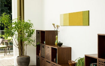 こちらは、アートではなく明るく爽やかなグリーンやイエローのファブリックパネルを壁にレイアウトしたパターンの実例。