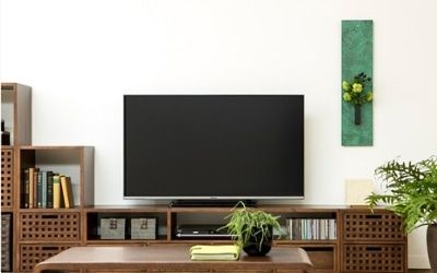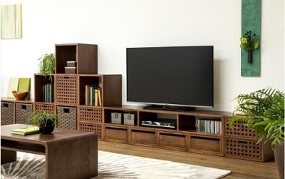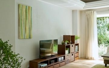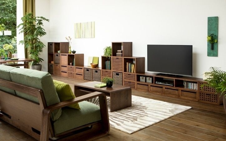 収納家具を無垢材の素材感が魅力のキューブシリーズで統一し、自然の穏やかさを表現したエナジーを感じるリビングコーディネート。組み合わせ自由自在のキューブでつくる壁一面の表情豊かな収納は、見る人の心を和ませてくれます。グリーンの壁面装飾やソファカバー、存在感ある植物がより自然の生命力を感じさせます。