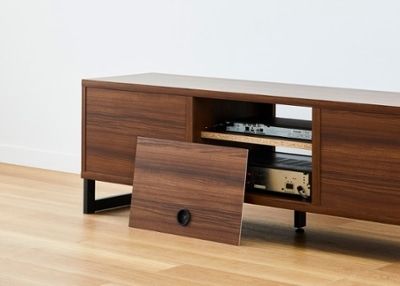 背板は取り外し可能のため、取り外せば奥行きのあるAV機器なども設置可能。また、収納棚の仕切板の奥にコード通し用の隙間があり、別の収納棚に入った機器同士の接続も可能です。