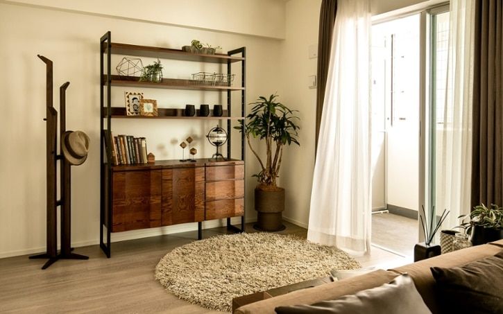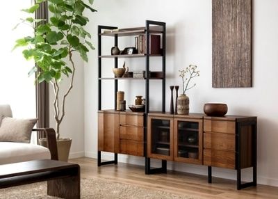 素材感を楽しむリビングシェルフ×リビングボードの組み合わせ