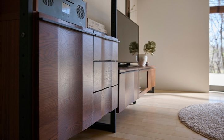 無垢材の温もりと美しい曲線を描いたシルエットがハーモ・テレビボードと調和します。