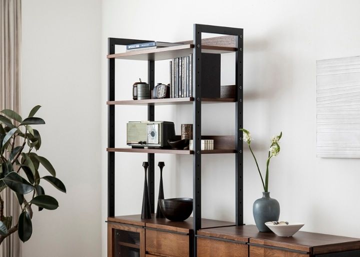 ハーモ・リビングボードは、別売りのシェルフパーツを購入することで、棚有りタイプのハーモ・リビングシェルフにチェンジ可能。家具を置く幅を変えずとも、さらなる魅せる収納も楽しめる暮らしを手に入れることができます。