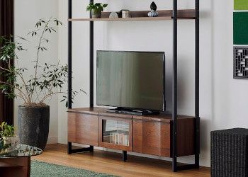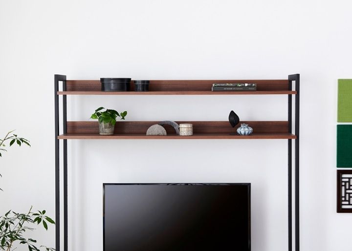 アイアンフレームならではの抜け感のあるデザインと自分らしいディスプレーを楽しむことができる「ハーモ・テレビボード・シェルフ(GB)」。無垢材の温もりある素材感が空間に優しく広がります。