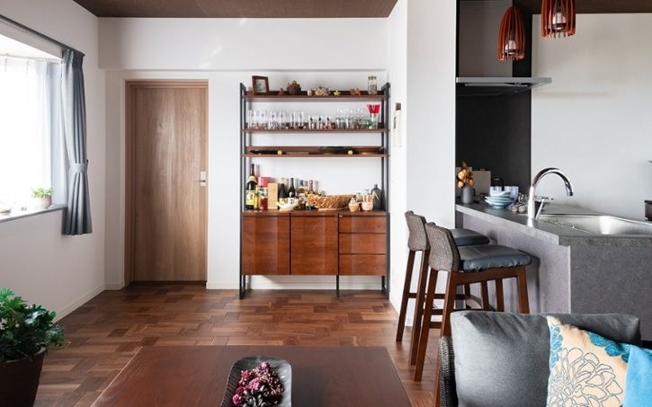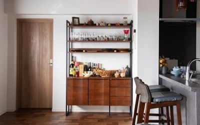 隠すと魅せる収納を上手に活用し、生活感は隠しながらも、お気に入りのお酒やグラスを飾って自分らしい魅せるディスプレーを楽しんでいるダイニング。まるで、バーのような雰囲気で毎日の暮らしが楽しくなりますね。