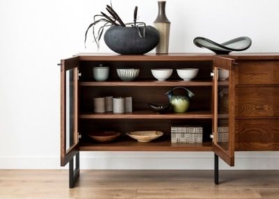 こちらは、開き扉にガラスを採用したガラスタイプ。お気に入りのものを飾るショーケースとして魅せる収納が楽しめます。また、ガラスにはお部屋をすっきり見せる効果もあるため、抜け感のある高めの脚デザインと相まって、開放感のある空間づくりを実現できる点もポイントです。