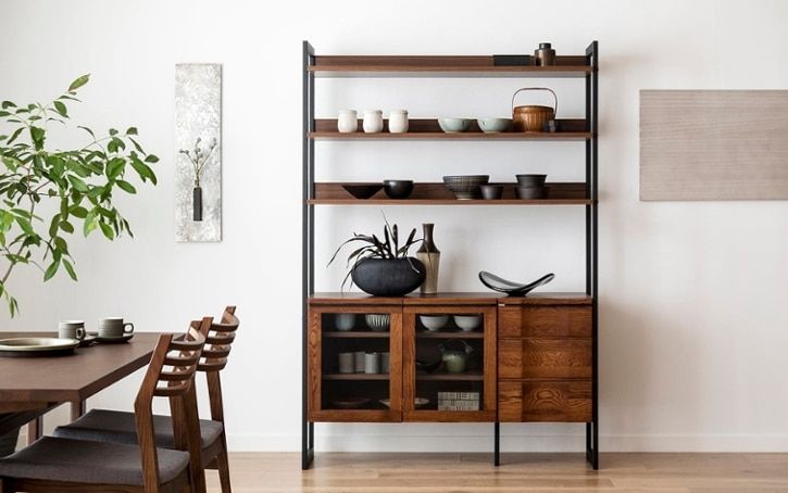 無垢材の重厚感とハイタイプの収納家具ならではの存在感を楽しみつつも、抜け感のあるシルエットで余白のある美しい空間づくりを実現できる「ハーモ・リビングシェルフ(GB)」。お好みで無垢扉とガラス扉を選べます。