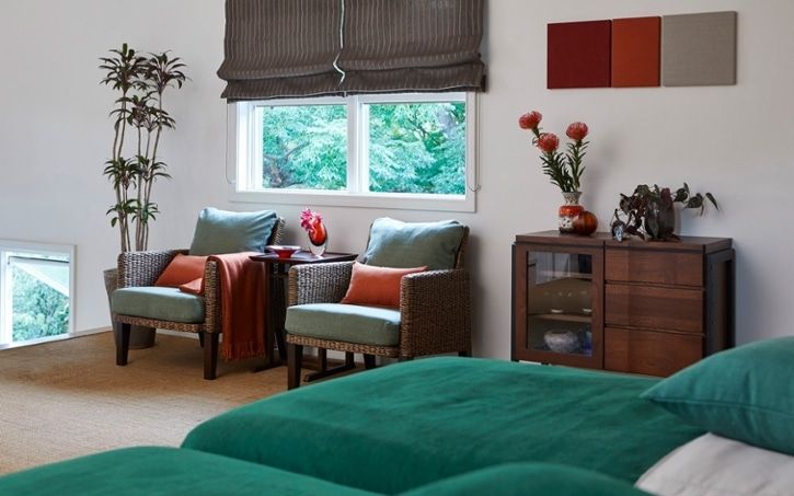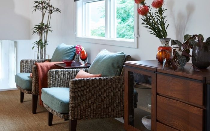 ベッドルームに、ヒヤシンス素材のラウンジチェアやハーモ・リビングボードをレイアウトして、まるでリゾートホテルのような特別感を演出した空間。自然の風合いが心地良く、リラックス感を漂わせます。