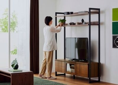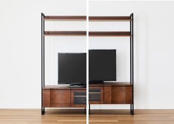 ハーモ・テレビボードは、別売りのテレビボード用シェルフのパーツを購入することで、棚有りタイプのハーモ・テレビボード・シェルフにチェンジ可能。家具を置く幅を変えずとも、魅せる収納も楽しめる暮らしを楽しめます。