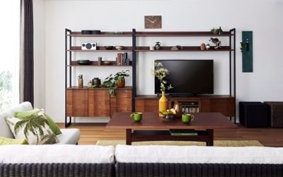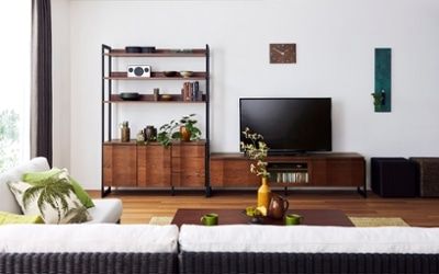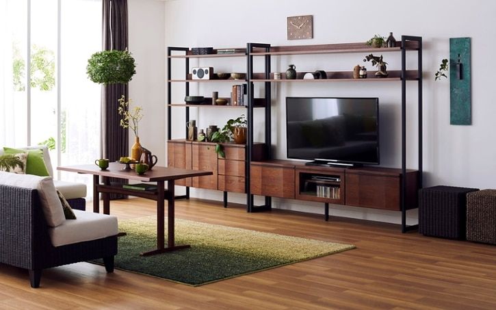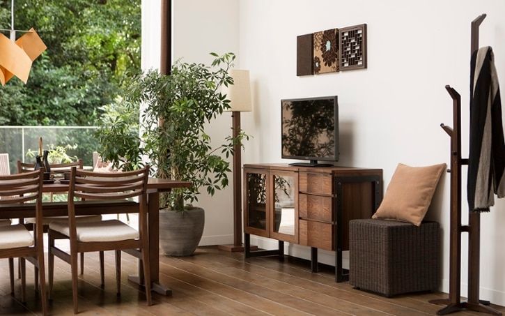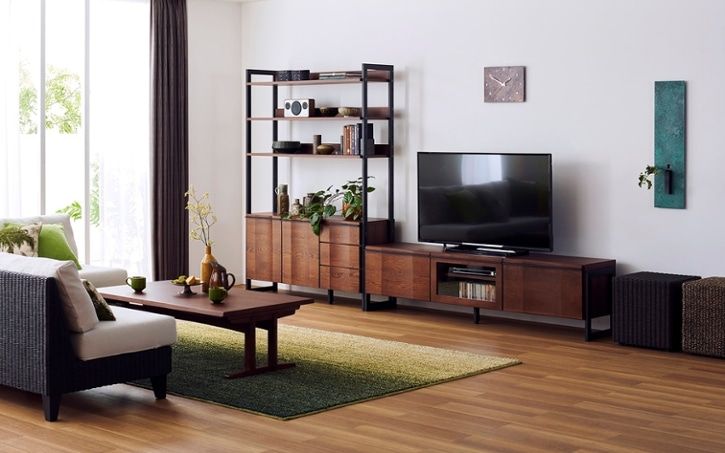 収納家具を無垢材とアイアンの調和が魅力のハーモシリーズで統一し、木々や大地の温もりを感じさせるウッドブラウンでまとめることで、温かみのあるリビングに。また、ハーモシリーズと同様に直線的なデザインで描かれたソファ・ローテーブルでコーディネートすることで、モダンで落ち着ける空間に仕上がっています。