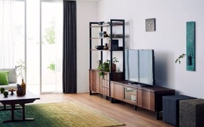 ハーモシリーズの脚元やガラス扉、シェルフなど抜け感のあるデザインがお部屋に開放感を与えます。また、壁面に大木を表現したアートパネルを飾ることで全体のバランスを整えました。