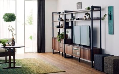 ハーモ・テレビボードとハーモ・リビングシェルフを並列して、幅3080mmの壁面収納として組んだ状態。テレビ周りをおしゃれに見せたい、お気に入りの雑貨を飾りたい方は取り入れてみましょう。アイアンフレームの抜け感とデザインもポイントです。