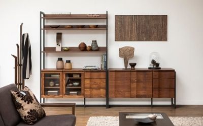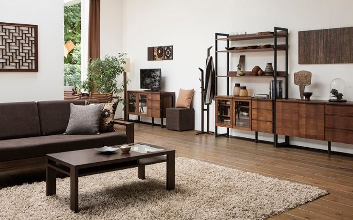 無垢材とアイアンを組み合わせた、自然的かつスタイリッシュなデザインが特長のハーモデザインは、ウッドブラウンの高級感のある雰囲気にぴったりです。また、どうしてもブラウンで統一した空間は重たくなってしまいがちですが、抜け感のあるハーモ収納家具シリーズなら、程良い軽やかさを演出できます。
