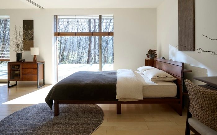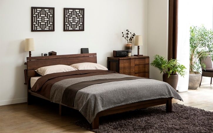 無垢材を贅沢に使用したベッドとリビングボードをレイアウトし、無垢材の素材感あふれる空間に。ベッドリネンやカーテン、ラグを心落ち着くブラウンでコーディネートした、快眠を誘う安らぎのベッドルームです。ヘッドボード上のウッドパネルが、落ち着いた中にもオリエンタルな雰囲気を醸し出します。