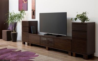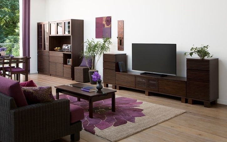 収納家具を美しい水平ラインが魅力のルーバーシリーズで統一し、オリエンタルな雰囲気のフラワーパープルでまとめることで、リゾートホテルのような優雅な空間に。蓮をモチーフにしたラグや壁面装飾は存在感のあるアイテムですが、ルーバーデザインがシンプルで洗練された印象なので、メリハリがつき上手くまとまります。