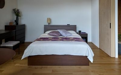ルーバー収納家具シリーズであるキャビネットとドレッサー、そしてヘッドボードに水平ラインのデザインを描いたベッドをさりげなくセレクトした、統一感のあるベッドルーム。落ち着いたダークブラウンの家具に映える、美しいパープルの花柄やシルバーのカーテン。艶やかな空間で贅沢なおやすみタイムを過ごせるでしょう。
