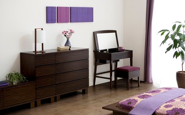 高級感のあるルーバーデザインの家具と、フラワーパープルスタイルは相性抜群。波のように繰り返されるデザインと、パープルの優雅な雰囲気は深いリラックス感を感じられるコーディネートを生み出します。また、どちらもオリエンタルな印象があるので、リゾートホテルのような非日常感を演出できるでしょう。