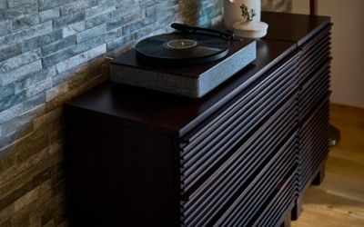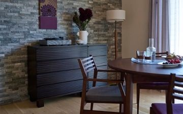 石壁が印象的なダイニングの空間。シンプルでありながら、無垢材の力強さと美しい水平ラインが特長のルーバー・キャビネットだからこそ心地良く空間に馴染み、整った暮らしを演出してくれます。また、柔らかな円形のダイニングテーブルと直線的なルーバーデザインのコントラストもおしゃれです。