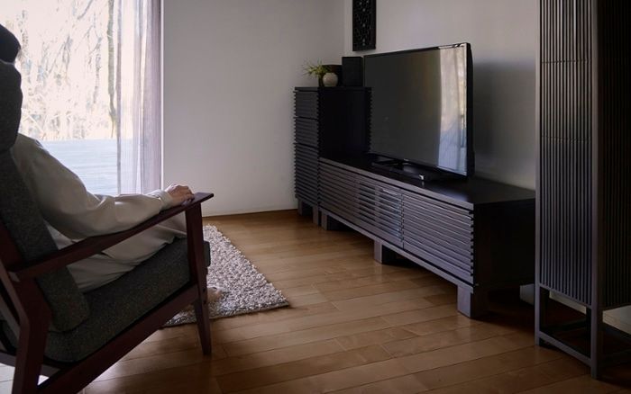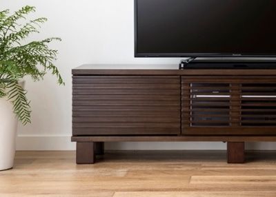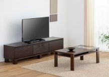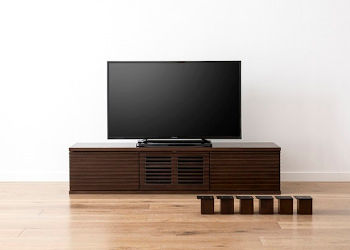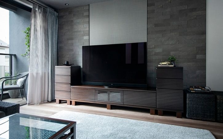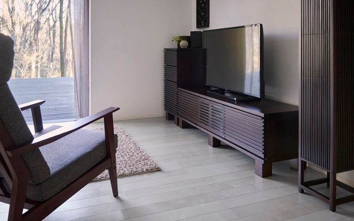テレビボードの左側に幅425mmを並列させ、少し離れた壁に幅850mmをレイアウト。ルーバーデザインが統一されているため、整然とした印象に。