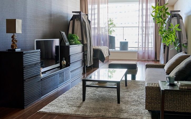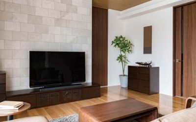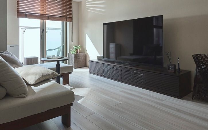 広々とした1LDK(LD16畳+K6畳)の空間を、ロースタイルの家具とブラウンカラーで彩ったインテリア実例。ローソファや脚無しのルーバーテレビボードで開放感のある部屋を実現しました。