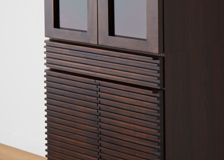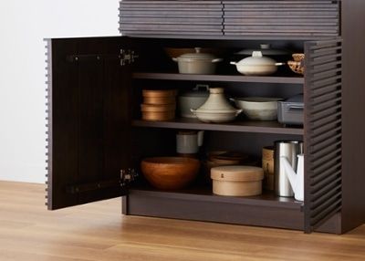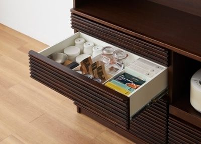 カップボードの下段部分は薄型の引出と開き扉の収納。美しいルーバーデザインを楽しめるだけでなく、収納力も抜群です。