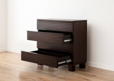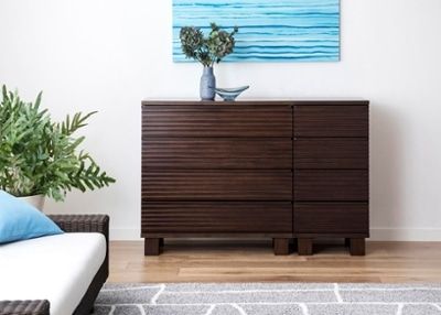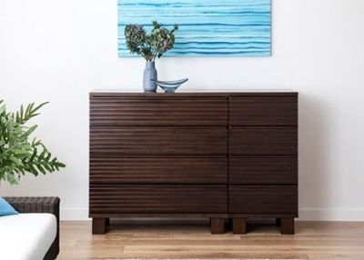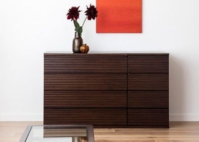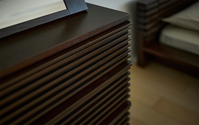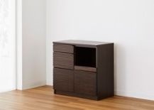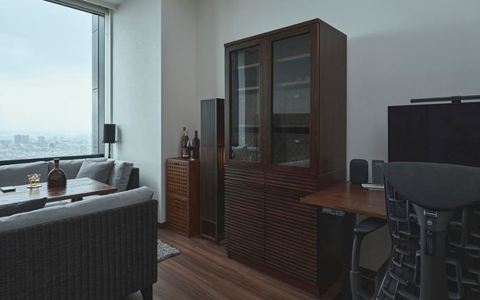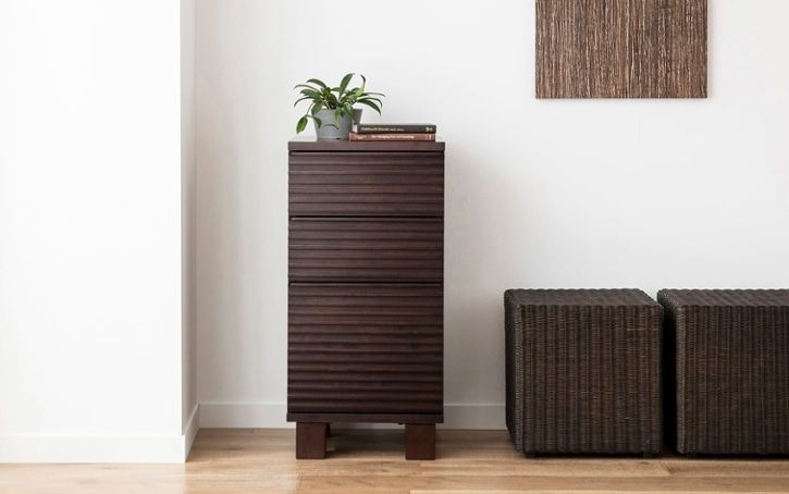 a.flatのルーバーシリーズ収納家具は、その洗練されたデザインとダークブラウンの色合いによって高級感を演出でき、まるでリゾートホテルのような特別な空間づくりを叶えてくれます。収納家具で整理整頓を行い、さらにルーバーデザインで生活感を感じさせないコーディネートを楽しみましょう。