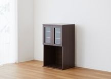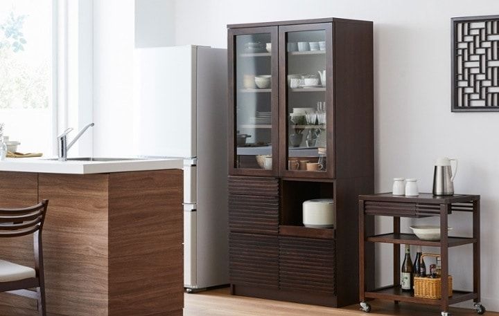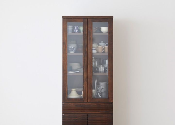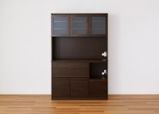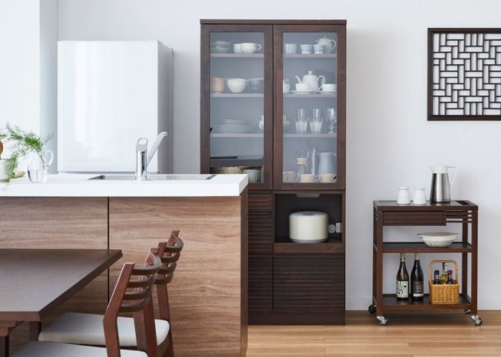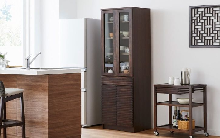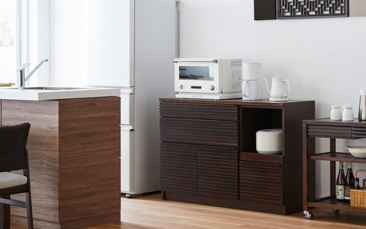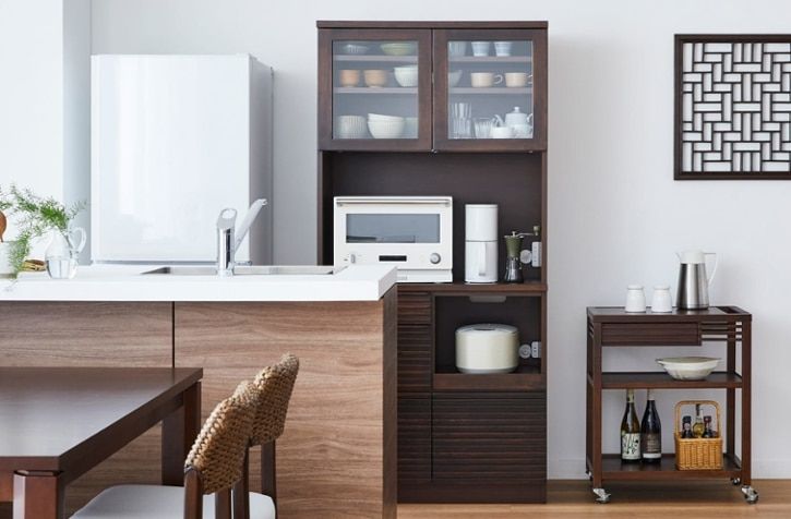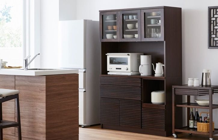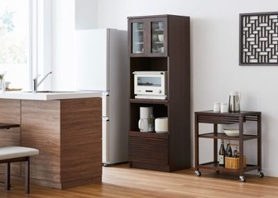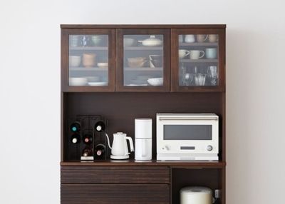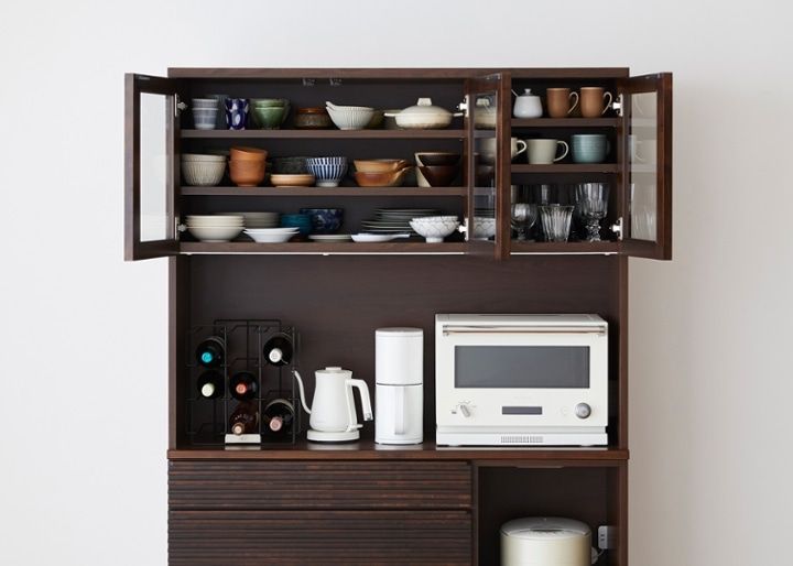 キッチンカップボードは、オープン収納スペースに家電を置くタイプ。家電置き場にゆとりがあるのでレンジ・トースターなどを収納したい方におすすめです。また、上段にはガラス扉、下段は薄型の引出と開き扉があり、1台でマルチに収納できるため、キッチンの広さが限られる一人暮らしの方にもぴったりなキッチン収納です。