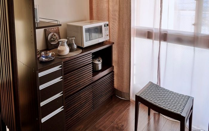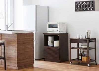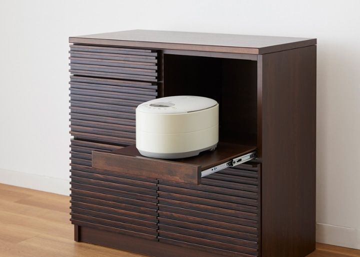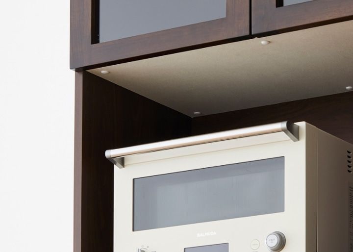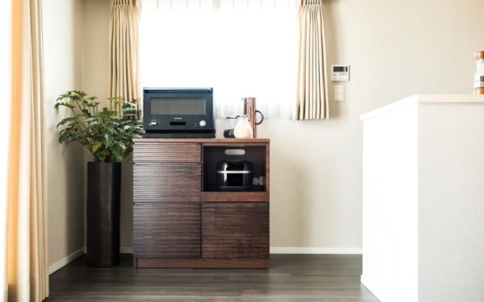 電子レンジやコーヒーメーカー、ケトルなどのキッチン家電が収納できます。レイアウトに応じて炊飯器も設置可能です。