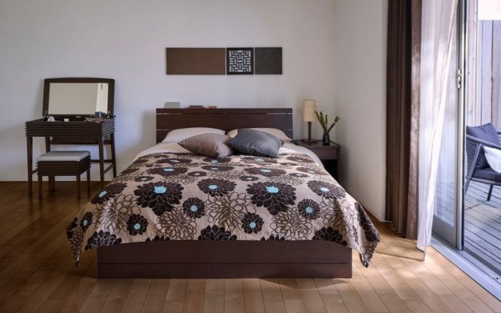 大容量の幅850mmのキャビネットと収納付きのベッドをセレクトし、コンパクトな間取りでもホテルのように整った部屋づくりを叶えた実例。ダークブラウンの色合いが高級感を感じさせます。