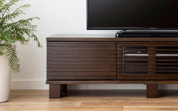 ルーバーならではの横ラインのデザインと開放的なロースタイルのテレビボードが調和し、心地良いリラックス感を漂わせる「ルーバー・テレビボードv02」。またデザインだけでなく、収納力や高い機能性も魅力です。
