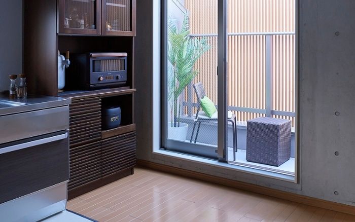 落ち着いた色合いのキッチンに合わせて、ルーバー・キッチンボードをセレクトしたダイニングキッチン。コンクリート張りのスタイリッシュな空間と調和し、キッチンを非日常的な雰囲気に見せています。