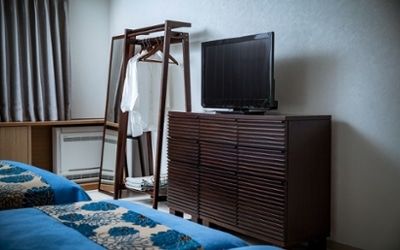 12畳の広々としたワンルーム。ソファ・ローベッド・テレビボードなど、すべての家具をロースタイルでまとめた開放感溢れるコーディネート。爽やかなブルーのアクセントカラーも相まって、海のような印象です。