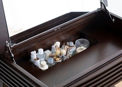 ドレッサーの奥には、背の高いボトルなどが置ける深めの収納も備えているので、化粧品を集約できるのが大きな魅力。さらに、着脱式棚板も付属しており、背の低いもの、背の高いものを合わせて収納可能です。