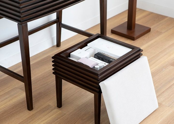 ルーバー・ドレッサースツールを合わせるのが断然おすすめ。ルーバー意匠が施された、美しく、そして快適な座り心地と機能が充実したスツールです。